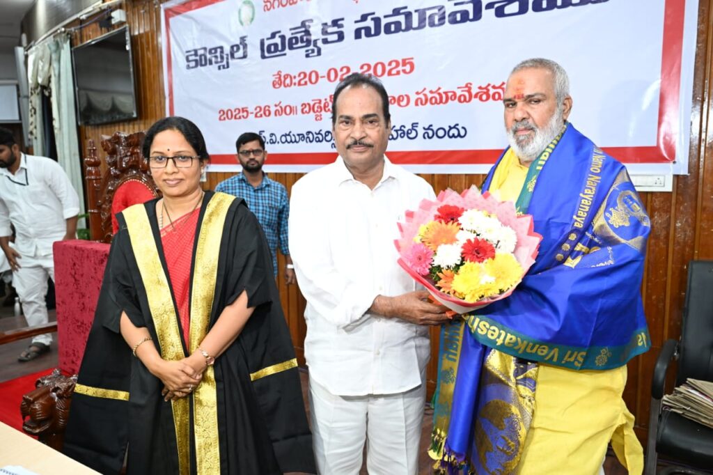 నేటి సాక్షి, తిరుపతి జిల్లా (బాదూరు బాల) : తిరుపతి నగర అభివృద్దే ధ్యేయంగా అందరూ కలసికట్టుగా పనిచేద్దామని ఎమ్మెల్యే ఆరణి శ్రీనివాసులు కార్పొరేటర్లు, అధికారులకు పిలుపునిచ్చారు. తిరుపతి మునిసిపల్ కార్పొరేషన్ కౌన్సిల్ సమావేశం గురువారం ఎస్వీ యూనివర్సిటీ సెనేట్ హాల్ నందు మేయర్ డాక్టర్ శిరీష అధ్యక్షతన కమిషనర్ ఎన్.మౌర్య అజెండాను ప్రవేశ పెట్టారు. కౌన్సిల్ సమావేశానికి ప్రత్యేక ఆహ్వానితులుగా తిరుపతి ఎమ్మెల్యే ఆరణి శ్రీనివాసులు, ఎం.ఎల్.సి. సిపాయి సుబ్రమణ్యం హాజరయ్యారు. అంతకు ముందు డిప్యూటీ మేయర్ గా ఆర్.సి.మునికృష్ణ ప్రమాణ స్వీకారం చేశారు. కార్పొరేటర్లు ఆయన్ను అభినందించారు. డిప్యూటీ మేయర్ ముద్ర నారాయణ, కార్పొరేటర్లు, అధికారులు హాజరైన కౌన్సిల్ సమావేశంలో ముందు సెక్రటరీ రాధిక బడ్జెట్ ను ప్రవేశపెట్టగా పలు అంశాలపై చర్చించి ఆమోదం తెలిపారు. అనంతరం మేయర్ శిరీష తో పాటు కొంతమంది కార్పొరేటర్లు సమావేశం నుండి బయట వెళ్ళారు. 12 గంటలకు జరగాల్సిన అజెండా అంశాల సాధారణ సమావేశంకు మేయర్, కార్పొరేటర్లు రాలేదు. తదుపరి సమావేశం నిర్వహించేందుకు తగినంత కోరం సభ్యులు ఉన్నందున, సీనియర్ సభ్యులైన డిప్యూటీ మేయర్ ముద్ర నారాయణ పేరును డిప్యూటీ మేయర్ మునికృష్ణ ప్రతిపాదించగా, సభ్యులు ఆమోదం తెలిపారు. దీంతో ఆయనకు మేయర్ హోదా కల్పించడంతో కౌన్సిల్ అజెండా పై చర్చించి ఆమోదం తెలిపారు. ఈ సందర్భంగా ఎమ్మెల్యే మాట్లాడుతూ అభివృద్ధి, సంక్షేమం రెండు కళ్లుగా తిరుపతిలో పనిచేస్తున్నామని అన్నారు. గత ప్రభుత్వంలో తీసుకున్న కొన్ని అనాలోచిత నిర్ణయాల వలన అభివృద్ధి జరగలేదని అన్నారు. ఇకనైనా అధికారులు, కార్పొరేటర్లు పార్టీలకు అతీతంగా సమన్వయంతో తిరుపతి అభివృద్ధికి కృషి చేయాలని అన్నారు. ఇటీవల కమిషనర్ మౌర్య స్కావెంజర్స్ కాలనిలో చేసిన అభివృద్ధి పనులు అందరినీ ఆకట్టుకున్నాయని అన్నారు. నగరంలో సుందరీకరణ పనులు బాగా చేస్తున్నారని, రోడ్లపై ఎక్కడా గుంతలు లేకుండా పూడ్చామని అన్నారు. సమష్టిగా, సమన్వయంతో పనులు చేయాలని పిలుపునిచ్చారు. కమిషనర్ ఎన్.మౌర్య మాట్లాడుతూ ప్రజాభివృద్దే ధ్యేయంగా పనులు చేస్తున్నామని అన్నారు. నగరంలోని అన్ని వార్డుల్లో అభివృద్ధి పనులు జరిగేలా నిధులు కేటాయించడం జరిగిందని అన్నారు. అధికారులు చేసే అభివృద్ధి పనులకు కార్పొరేటర్లు సహకరించాలని అన్నారు. అభివృద్ధి పనులకు తాము ఎప్పుడు బాసటగా నిలుస్తామనీ, వేగంగా పూర్తి చేసేందుకు అవకాశం ఉంటుందని అన్నారు.