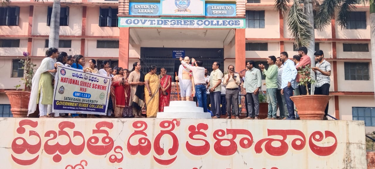 నేటి సాక్షి గోదావరిఖని (రమేష్) : గాంధీజీ వర్ధంతి – నేటి యువతకు గాంధీజీ మార్గదర్శనం. గోదావరిఖని ప్రభుత్వ డిగ్రీ కళాశాలలో మహాత్మాగాంధీ వర్దంతిని పురస్కరించుకొని ‘షహీద్ దివస్’ జరిపారు. కార్యక్రమంలో కళాశాల ప్రిన్సిపాల్ డా. జై కిషన్ ఓఝా కళాశాల ప్రాంగణంలో ఏర్పాటు. చేసిన గాంధీజీ విగ్రహానికి పూల మాల వేసి ఘనమైన నివాళి అర్పించారు. కార్యక్రమాన్ని ఎన్. ఎస్. ఎస్. వాలుంటీర్లు ఎన్. సీ. సీ. కాడేట్స్ సంయుక్తంగా నిర్వహించారు. సందర్భంగా ప్రిన్సిపాల్ మాట్లాడుతూ.గాంధీజీ యొక్క నిస్వార్దపూరితమైన జీవన విధానం, సత్యాగ్రహాన్ని నడిపించిన తీరు, క్విట్ ఇండియా ఉద్యమాన్ని నడిపించిన తీరు, దండి సత్యాగ్రహాన్ని ముందుకు తీసుకుపోయిన తీరు నేటి యువత ఎంతైనా ఆదర్శంగా తీసుకోవాలన్నారు. గాంధీజీ యొక్క సాదా సీదా జీవన విధానం ఎంతైనా అనుసరణియం అన్నారు. ప్రతిష్టమైన గాంధీజీ నాయకత్వం అసంఖ్యాకమైన శిస్యఘణాన్ని ఏర్పరచిందని అన్నారు. ఈ దేశ సమైక్యత కోసం గాంధీజీ చివరి శ్వాస వరకు జీవించారని వీరి త్యాగ పూరితమైన జీవితాన్ని విద్యార్థులందరూ ఆదర్శంగా తీసుకొని ఈ దేశాన్ని ముందుకు తీసుకుపోవాలని సూచించారు. ఈ కార్యక్రమంలో లో ఎన్. ఎస్. ఎస్. ప్రోగ్రాం ఆఫీసర్లు ఏ. సాంబశివ రావు, డా. కిరణ్మయి, ఎన్. సి. సి ఏ. ఎన్. ఓ లెఫ్టినెంట్ తిరుపతి, స్టాఫ్ క్లబ్ సెక్రటరీ డా. సుబ్బారావు, సీనియర్ అధ్యాపకులు సవిత, డా. శారద, శ్రీదేవి, డా. శంకరయ్య, డా. సురేష్, ఆంజనేయులు, డా. రామకృష్ణ, డా. స్రవంతి, డా. పి ఉషా రాణి, వి. నరేష్, డా. రవీందర్, సమత, అరుణ , బి. నరేష్, కిరణ్ కుమార్ తదితరులు, ఎన్. ఎస్. ఎస్. వాలంటీర్లు, ఎన్. సి. సి కాడేడ్స్ పాల్గొన్నారు.