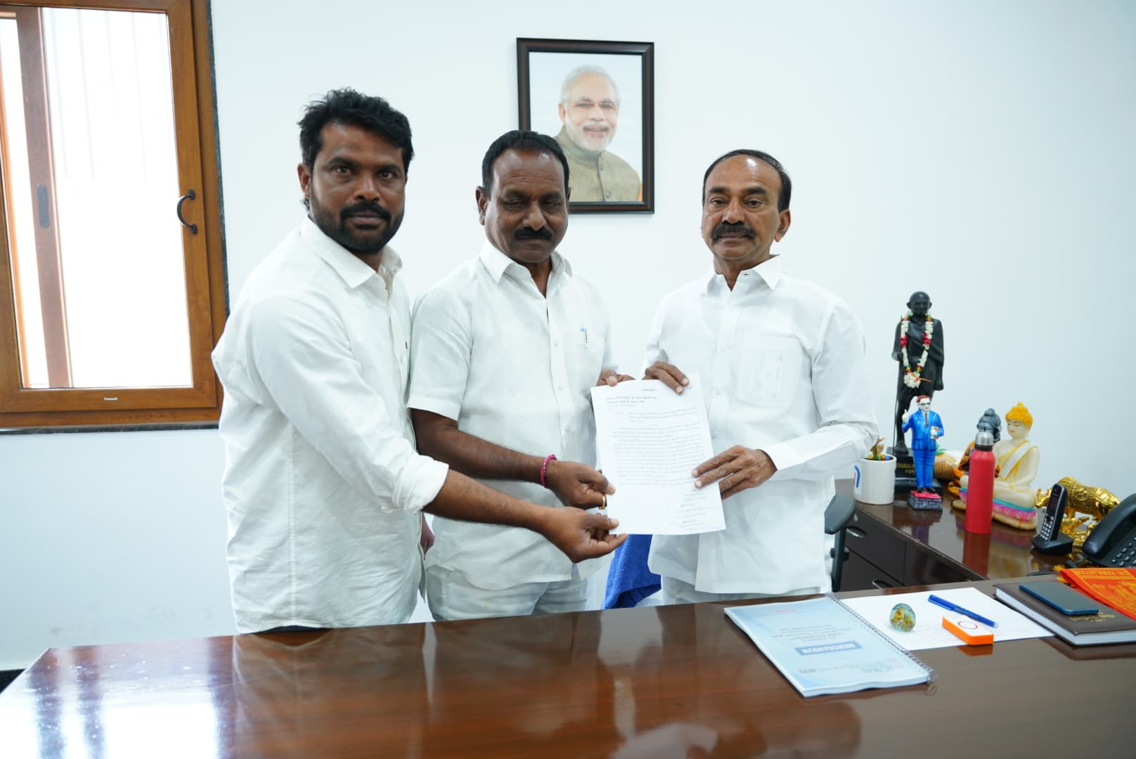 ప్రజా సమస్యలు పరిష్కారంలో బాగంగా పార్టీలకు అతీతంగా మల్కాజిగిరి పార్లమెంటు సభ్యులు ఈటెల రాజేందర్ ని మర్యాద పూర్వకంగా హైదరాబాద్లో తన నివాసంలో మర్యాద పూర్వకంగా కలిసిన జమ్మికుంట పట్టణ కాంగ్రెస్ నాయకులు.కొత్తపల్లి గ్రామం నుండి జమ్మికుంట రైల్వే స్టేషన్ బయటకు వెళ్ళేటానికి ఫుట్ బోర్డు వంతెన నిర్మాణానికి నిధులు మంజూరు చేయాలని వినతి పత్రం అందజేశారు.సత్వరమె సమస్యా పరిష్కారం చేయాలని విజ్ఞప్తి చేసారు. గత ఎన్నో ఏళ్లుగా జమ్మికుంట రైల్వే స్టేషన్ నుండి కొత్తపల్లి గ్రామం,దర్మారం, రామన్న పల్లే, ఇతర గ్రామాలకు రైల్వే స్టేషన్ నుండి రైల్వే ట్రాక్ దాటి నడుచుకుంటూ వెళ్ళేవారు.కానీ ఇప్పుడు రైల్వే ట్రాక్ లైన్లు పెంచడం వలన కొత్తపల్లి గ్రామ శివారులో గల రైల్వే కాంపౌండ్ వాల్ కు ఉన్న చిన్న చిన్న దారులను కూడా మూసి వేస్తున్నారు.రైల్యే గోడకు ఆనుకుని 9 ఫీట్ల డ్రైనేజీ నిర్మాణం కూడా చేస్తున్నారు.ఇందువలన కొత్తపల్లి ఇతర గ్రామాల నుండి నడక దారిన రైల్వే స్టేషన్ నుండి జమ్మికుంట పట్టణానికి పొయే వారు విద్యార్థులు, చిన్న చిన్న వ్యాపారాలు చేసుకునే వారు, దినసరి కూలీలు, గుమాస్తాలు, పేషెంట్లు,దివ్యాంగులు వీరు చాలా ఇబ్బంది పడుతున్నారనీ,సుమారుగా 20 వేల జనాభా కలిగిన కొత్తపల్లి గ్రామం నిత్యం ప్రతి దినము అన్నీ అవసరాలకు, జీవనోపాధికి జమ్మికుంట మీదనే ఆధారపడి ఉన్నారు.ఈ యొక్క జమ్మికుంట రైల్వే ట్రాక్ దాటడం వలన చాలా మంది రైలు ఢీకొని మరణించడం జరుగుతుందని,గత 10 రోజుల క్రితం ఒక ముస్లిం అమ్మాయి రైల్వే ట్రాక్ దాటుతుండగా ప్రమాదవశాత్తు రైలు ఢీకొని మరణించినది. ఇది ఇలా ఉండగా ప్రతి రోజు నిత్యం ఇతర గ్రామాల ప్రజలు కొత్తపల్లి గ్రామం నుండి జమ్మికుంట రైల్వే స్టేషన్ కు వేలాది మంది రైలు మార్గం ద్వారా ఇతర ప్రాంతాలకు వెళ్లే టానికి ప్రయాణికులు వస్తుంటారు. అని ఈటెల రాజేందర్ కి పూర్తిగా వివరించి ఫుట్ బోర్డు వంతెన నిర్మాణానికి కృషి చేయాలని వారు కోరారు.ఈటెల రాజేందర్ ఈవిషయమై సానుకూలంగా స్పందించి తప్పకుండా ఫుట్ బోర్డు వంతెన నిర్మాణానికి కృషి చేస్తానని ప్రజల సమస్యల్ని తీర్చుతానని హామీ ఇచ్చారు. అందచేసిన వారిలో జమ్మికుంట పట్టణ కాంగ్రెస్ పార్టీ మాజీ అధ్యక్షులు కసుబోజుల వెంకన్న, హుజూరాబాద్ నియోజకవర్గ కాంగ్రెస్ పార్టీ మైనారిటీ సెల్ అధ్యక్షుడు MD. సలీం పాషా, ఉన్నారు.