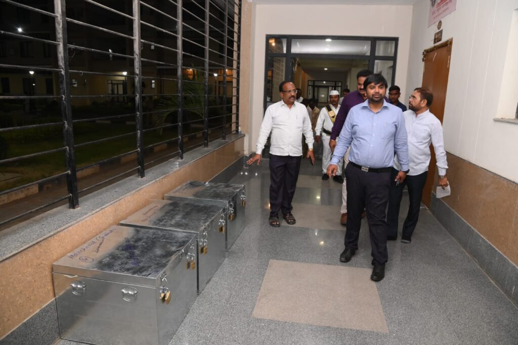 నేటి సాక్షి, మంచిర్యాల జిల్లా ప్రతినిధి:– మెదక్, నిజామాబాద్, ఆదిలాబాద్, కరీంనగర్ నియోజకవర్గాల ఉపాధ్యాయ, పట్టభద్రుల ఎమ్మెల్సీ ఎన్నికల నిర్వహణలో భాగంగా ఎన్నికల సంబంధిత సామాగ్రి జిల్లాకు చేరుకుందని జిల్లా ఎన్నికల అధికారి, కలెక్టర్ కుమార్ దీపక్ తెలిపారు. శనివారం జిల్లాకు చేరుకున్న ఎన్నికల సామాగ్రిని జిల్లాలోని నస్పూర్ లో గల సమీకృత జిల్లా కార్యాలయాల భవన సముదాయంలో రక్షణ చర్యల మధ్య భద్రపరిచారు. ఈ సందర్భంగా జిల్లా ఎన్నికల అధికారి, కలెక్టర్ మాట్లాడుతూ, ఉపాధ్యాయ, పట్టభద్రుల శాసనమండలి సభ్యుల ఎన్నికల నిర్వహణ కొరకు జిల్లాలో ఎన్నికల సంఘం నిబంధనల ప్రకారం చర్యలు తీసుకోవడం జరుగుతుందని తెలిపారు. ఈ క్రమంలో ఎన్నికల నిర్వహణలో భాగంగా ఛాలెంజ్ ఓట్ల పేపర్లు, ఫారాలు 7బి, 14, 14ఎ, 15, బ్యాలెట్ పేపర్ అకౌంట్ ఫారం -16, బ్యాలెట్ బ్యాక్స్ లు, బ్యాలెట్ పేపర్లు, పోలింగ్ అధికారులు, పోలింగ్ ఏజెంట్లకు అందించే గుర్తింపు కార్డులు, బ్యాలెట్ పేపర్స్ కౌంటర్ ఫైల్స్, పేపర్ సీల్స్, మెటల్ సీల్స్, ఫర్నీచర్, ఇంకు బాటిళ్లు, సీలింగ్ వాక్స్, గన్నీ సంచులతో పాటు ఇతర ఎన్నికల సంబంధిత సామాగ్రి జిల్లాకు చేరుకుందని తెలిపారు. ఎన్నికల సంఘం ఆదేశాల మేరకు అధికారులు, సిబ్బందికి పంపిణీ చేసేందుకు అవసరమైన చర్యలు తీసుకోవడం జరుగుతుందని తెలిపారు. ఈ కార్యక్రమంలో జిల్లా అదనపు కలెక్టర్ సబావత్ మోతిలాల్, మంచిర్యాల, బెల్లంపల్లి రాజస్వ మండల అధికారులు శ్రీనివాస్ రావు, హరికృష్ణ, వివిధ మండలాల తహశిల్దార్లు, కలెక్టరేట్ పరిపాలన అధికారి రాజేశ్వర్, ఎన్నికల విభాగం పర్యవేక్షకులు కెవై ప్రసాద్, సంబంధిత అధికారులు తదితరులు పాల్గొన్నారు.