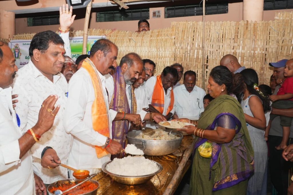 నేటి సాక్షి ప్రతినిధి, వేములవాడ (కోక్కుల వంశీ) : అన్ని దానాల కన్నా అన్నదానం గొప్పదని మహాశివరాత్రి జాతరకు వచ్చే భక్తులకు అన్నదానం చేయడం ప్రశంసనీయమని ప్రభుత్వ విప్ ఆది శ్రీనివాస్ అన్నారు. వేములవాడ వాసవి సేవా సమితి, మన చారిటబుల్ ట్రస్ట్ ఆధ్వర్యంలో లక్ష్మీ గణపతి కాంప్లెక్స్ లో ఏర్పాటుచేసిన అన్నదాన కార్యక్రమాన్ని ఆయన ప్రారంభించారు. ఈ సందర్భంగా ప్రభుత్వ విప్ మాట్లాడుతూ… ఎన్నో సంవత్సరాలుగా మహా శివరాత్రి పర్వదినాన్ని పురస్కరించుకొని భక్తులకు మూడు రోజులపాటు అన్నదాన కార్యక్రమాన్ని నిర్వహించడం గొప్ప విషయం అని అన్నారు. అన్నదాన కార్యక్రమానికి సహకరించిన దాతలకు, నిర్వాహకులకు అభినందనలు తెలిపారు.