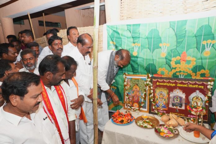 నేటి సాక్షి ప్రతినిధి, వేములవాడ (కోక్కుల వంశీ) : అన్ని దానాల కన్నా అన్నదానం గొప్పదని మహాశివరాత్రి జాతరకు వచ్చే భక్తులకు అన్నదానం చేయడం ప్రశంసనీయమని ప్రభుత్వ విప్ ఆది శ్రీనివాస్ అన్నారు. వేములవాడ వాసవి సేవా సమితి, మన చారిటబుల్ ట్రస్ట్ ఆధ్వర్యంలో లక్ష్మీ గణపతి కాంప్లెక్స్ లో ఏర్పాటుచేసిన అన్నదాన కార్యక్రమాన్ని ఆయన ప్రారంభించారు. ఈ సందర్భంగా ప్రభుత్వ విప్ మాట్లాడుతూ… ఎన్నో సంవత్సరాలుగా మహా శివరాత్రి పర్వదినాన్ని పురస్కరించుకొని భక్తులకు మూడు రోజులపాటు అన్నదాన కార్యక్రమాన్ని నిర్వహించడం గొప్ప విషయం అని అన్నారు. అన్నదాన కార్యక్రమానికి సహకరించిన దాతలకు, నిర్వాహకులకు అభినందనలు తెలిపారు.