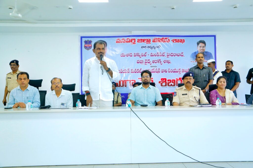 గురువారం రోజు జిల్లా పోలీసు కార్యాలయంలో జిల్లా పోలీసుశాఖ ఆధ్వర్యంలో యశోద హాస్పిటల్ మలక్ పేట్ హైదరాబాద్ జిల్లా వైద్యా ఆరోగ్యశాఖ మరియు ఇండియన్ మెడికల్ అసోసియేషన్ వారి సౌజన్యంతో ఏర్పాటు చేసిన ఉచిత మెగా వైద్య శిబిరాన్ని జిల్లా కలెక్టర్,ఆదర్శ్ సురభి, ఐఏఎస్, వనపర్తి ఎమ్మెల్యే, తూడిమేగారెడ్డి ముఖ్య అతిథులుగా పాల్గొని జిల్లా ఎస్పీ రావుల గిరిధర్ ఐపిఎస్,తెలంగాణ రాష్ట్ర బాలల హక్కుల పరిరక్షణ కమిషన్ సభ్యురాలు శ్రీమతి అపర్ణ తో రిబ్బన్ కట్ చేసి ప్రారంభించారు. ఈ వైద్య శిబిరంలో జిల్లా ఎస్పీ శ్రీ రావుల గిరిధర్ ఐపిఎస్ వారి సతీమణి శ్రీమతి అపర్ణ స్వయంగా వైద్య పరీక్షలు చేయించుకున్నారు వైద్య శిబిరంలో ఉన్నత అధికారి నుండి హోంగార్డ్స్ వరకు ఈసీజీ, బిపి, షుగర్ పరీక్ష, పల్స్ రేట్, 2డి ఎకో, కంటి, ఎక్సరే, 252 రకాల రక్త పరీక్షలు వివిధ రకాల వైద్య పరీక్షలు చేయించుకున్నారు.ఈ సందర్బంగా ఎమ్మెల్యే తూడి మేఘారెడ్డి గారు మాట్లాడుతూ..శాంతిభద్రతలు కాపాడడం కోసం పోలీసులు 24 గంటలు అందుబాటులో ఉండి శ్రమిస్తారని, వారికి ఆరోగ్యం కూడా ఎంతో ప్రధానమని చెప్పారు. మన ఆరోగ్యం మన చేతుల్లోనే ఉంటుంది నిత్యం వ్యాయామం చేస్తూ ఎలాంటి రోగాలు దరిచేరకుండా జాగ్రత్తలు పాటించాలని ఆయన అన్నారు. రాష్ట్ర ప్రభుత్వం వైద్య రంగానికి ప్రథమ ప్రాధాన్యత ఇస్తుందని చెప్పారు. జిల్లా కలెక్టర్ కూడా బాధ్యతలు చేపట్టినప్పటి నుంచి విద్యా వైద్యంపై ప్రధాన దృష్టి సారించారని కొనియాడారు. అడిగిన వెంటనే వైద్య రంగానికి అన్ని విధాలుగా సహకారం అందిస్తున్నారని చెప్పారు. వనపర్తి జీజీహెచ్ కు, ఎంసిహెచ్ కు ఆక్సిజన్ ప్లాంట్లు ఏర్పాటు చేయడం జరిగిందన్నారు. వనపర్తి నియోజకవర్గం లోని పెబ్బేరు కు 30 పడకల ఆసుపత్రి, వనపర్తి లో 500 పడకల ఆసుపత్రి నిర్మించేందుకు ప్రభుత్వం చర్యలు తీసుకుంటుంది అన్నారు.ఈ సందర్బంగా కలెక్టర్ మాట్లాడుతూ శాంతి భద్రతలు కాపాడడంలో పోలీసులది కీలక పాత్ర అని, కాబట్టి పోలీసులు తమ ఆరోగ్యాన్ని జాగ్రత్తగా కాపాడుకోవాలని సూచించారు. ప్రతి ఆరు నెలలకు ఒకసారి లేదా కనీసం సంవత్సరానికి ఒకసారి అయినా వైద్య పరీక్షలు చేయించుకోవాలని, తద్వారా మనకి ఏవైనా రోగాలు వచ్చే అవకాశం ఉంటే ముందుగానే తెలుసుకొని జాగ్రత్త చర్యలు తీసుకోగలుగుతామని చెప్పారు.జిల్లాలో వైద్య ఆరోగ్యశాఖ తరఫున ఎన్నో కార్యక్రమాలు చేపడుతున్నామని అందులో భాగంగా మిషన్ మధుమేహ, టీబీ వంటి కార్యక్రమాలతో ప్రజలందరికీ పరీక్షలు చేసి వాటిపై ముందస్తుగా అవగాహన కల్పించడం జరుగుతుందన్నారు. ఈ వైద్య శభిరాన్ని అందరూ సద్వినియోగం చేసుకోవాలని సూచించారు.ఈ సందర్భంగా ఎస్పీ మాట్లాడుతూ పోలీసుఅధికారులు, సిబ్బంది ఎల్లప్పుడు విధినిర్వహణలో ఉండటం వలన తమ ఆరోగ్యం 