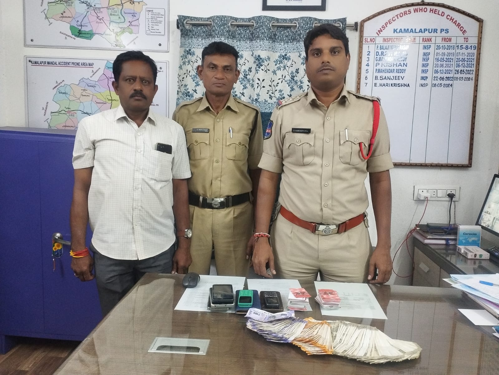 హనుమకొండ జిల్లా కమలాపూర్ మండలంలోని శుక్రవారం రోజు సాయంత్రం సుమారు 7.30 గం. ల సమయం లో లక్ష్మిపురం గ్రామ శివారు లో టాస్క్ ఫోర్స్ పోలీసులు పేకాట శిబిరం పై దాడి చేసి 7 గురు వ్యక్తులైన లక్కం రాజేందర్ పరకాల, గట్ల మల్లేశం శనిగరం, బోయిని రాజేష్ పరకాల, అవునూరి రాజకుమార్ గూడూరు, బండి కుమారస్వామి శనిగరం, బొమ్మకంటి సుదీర్ పరకాల, అవనిగంటి హిమావంత్ పరకాల వారిని అదుపులో లో తీసుకొని వారి వద్ద నుండి 54400/-, 52 ప్లేయింగ్ కార్డ్స్, 7 మొబైల్స్ స్వాధీనం చేసుకొని వారిపై కేసు నమోదు చేయటం జరిగిందని సీఐ ఈ.హరికృష్ణ తెలిపారు. పేకాట, ఆల్కహాల్, డ్రగ్స్ కు బానిస కాకుండా ఇలాంటి వాటికి దూరంగా ఉండాలని యువత తమ జీవితాలను నాశనం చేసుకోవద్దని పట్టుబడ్డ వ్యక్తులపై కఠిన చర్యలు ఉంటాయని ఈ సందర్భంగా సిఐ హరికృష్ణ పలు సూచనలు చేశారు.