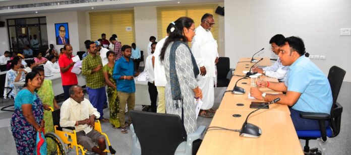 నేటి సాక్షి ప్రతినిధి, రాజన్న సిరిసిల్ల ( కోక్కుల వంశీ ): ప్రజా సమస్యలను పరిష్కరించడానికే ప్రజావాణి కార్యక్రమాన్ని నిర్వహిస్తున్నామని జిల్లా కలెక్టర్ సందీప్ కుమార్ ఝా తెలిపారు. సోమవారం జిల్లా సమీకృత కార్యాలయాల సముదాయంలో ప్రజావాణి నిర్వహించి కలెక్టర్ సందీప్ కుమార్ ఝా , అదనపు కలెక్టర్ ఖీమ్యా నాయక్ ప్రజల నుంచి దరఖాస్తులు స్వీకరించారు. అనంతరం కలెక్టర్ సందీప్ కుమార్ ఝా మాట్లాడుతూ.. ప్రజావాణిలో వచ్చే అర్జీలు ఎప్పటికప్పుడు పరిష్కరించాలని పెండింగ్లో పెట్టవద్దని స్పష్టం చేశారు. ప్రజావాణిలో ఆయా శాఖల ఉన్నతాధికారులు తదితరులు పాల్గొన్నారు.