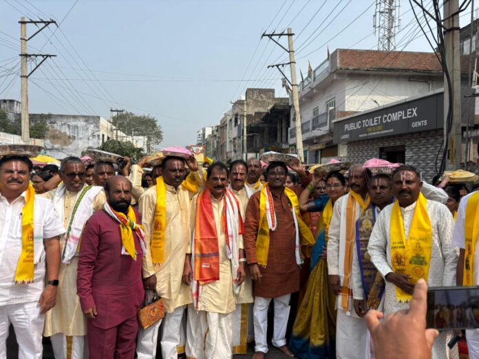 నేటి సాక్షి, కరీంనగర్: కరీంనగర్ పట్టణ పద్మశాలి సంఘం ఆధ్వర్యంలో శ్రీ లక్ష్మీపద్మావతి సమేత వేంకటేశ్వర స్వామి వారి బ్రహ్మోత్సవాలను పురస్కరించుకుని, పద్మశాలి ఆడబిడ్డ అయిన పద్మావతి అమ్మవారికి సోమవారం ఘనంగా పుట్టింటి సారెను సమర్పించారు. పట్టణ పద్మశాలి సంఘం అధ్యక్షులు గడ్డం శ్రీరాములు గారి నేతృత్వంలో నిర్వహించిన ఈ కార్యక్రమంలో పద్మశాలి కులబాంధవులు కుటుంబ సమేతంగా సాంప్రదాయ దుస్తులు ధరించి, శోభాయాత్రగా తరలివచ్చారు. అమ్మవారికి పట్టు వస్త్రాలు, తలంబ్రాలు, మంగళప్రదమైన సారెను భక్తిశ్రద్ధలతో అందజేశారు. ఈ సందర్భంగా సంఘం ప్రతినిధులు మాట్లాడుతూ “తిరుచానూర్ (తిరుపతి)లో పద్మావతి అమ్మవారికి అధికారికంగా సారె సమర్పించే ఆనవాయితీని స్ఫూర్తిగా తీసుకుని, కరీంనగర్‌లో కూడా ఏటా ఈ సంప్రదాయాన్ని కొనసాగిస్తున్నాం. వేంకటేశ్వర స్వామి వారి కల్యాణానికి ముందు రోజు అమ్మవారికి పుట్టింటి కానుకలు సమర్పించడం మా అదృష్టంగా భావిస్తున్నాం” అని ఆనందం వ్యక్తం చేశారు. ఈ కార్యక్రమంలో జిల్లా పద్మశాలి సంఘం అధ్యక్షులు మెతుకు సత్యం, గౌరవ అధ్యక్షుడు వాసాల రమేష్, పోపా జిల్లా అధ్యక్షుడు పోలు సత్యనారాయణ, దేవసాని పాపన్న, మోర రాజేశం, అల్స భద్రన్న, జిల్లా యువజన సంఘం అధ్యక్షులు గుడిమల్ల శ్రీకాంత్, పట్టణ పద్మశాలి సంఘం ప్రధాన కార్యదర్శి వంగర ఆంజనేయులు, కోశాధికారి గజవెల్లి కనకయ్య, ఉపాధ్యక్షులు తెల్ల చంద్రశేఖర్, ఎలిగేటి శ్రీనివాస్, సంయుక్త కార్యదర్శులు వడ్డేపల్లి జ్యోతి, ఉషకోయిల సుజాత, బొల్లి రవి, పొరండ్ల రమేష్, నల్ల శ్రీధర్, మాసం సుధాకర్, బొల్లబత్తిని రవీందర్ మరియు పెద్ద సంఖ్యలో కులబాంధవులు పాల్గొన్నారు.