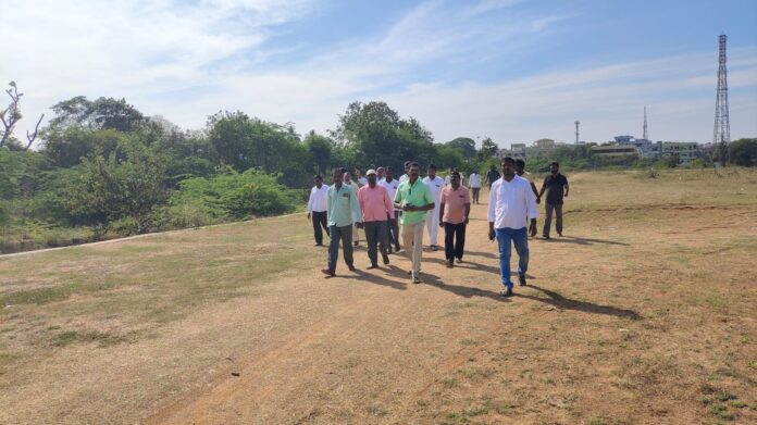 వేములవాడ పట్టణంలోని భగవంత రావు నగర్ ఆనుకొని ఉన్న గుడి చెరువు ఎఫ్ టి ఎల్ ను ఆర్డీవో రాజేశ్వర్, మున్సిపల్ కమిషనర్ అన్వేశ్, ఇరిగేషన్ డిఈ ప్రశాంత్ లు గురువారం పరిశీలించారు.