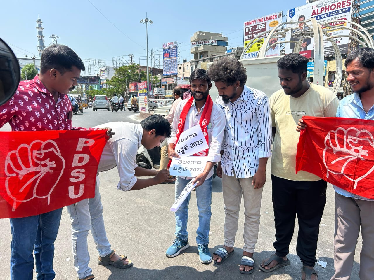 రాష్ట్ర బడ్జెట్ లో విద్యారంగానికి స్వల్ప నిధుల కేటాయింపును ను నిరసిస్తూ ప్రగతిశీల ప్రజాస్వామ్య విద్యార్థి సంఘం PDSU కరీంనగర్ జిల్లా కమిటీ ఆధ్వర్యంలో జిల్లా కేంద్రంలోని తెలంగాణ చౌక్ లో బడ్జెట్ ప్రతులను దగ్ధం చేశారు. ఈ సందర్భంగా PDSU కరీంనగర్ జిల్లా ప్రధాన కార్యదర్శి కూతాటి రాణా ప్రతాప్ మాట్లాడుతూ ఆర్థిక శాఖ మంత్రి బట్టి విక్రమార్క అసెంబ్లీలో ప్రవేశపెట్టిన బడ్జెట్ లో విద్యారంగానికి స్వల్పనిధులు కేటాయించడం బాధ్యతరాహిత్యానికి నిదర్శనం అన్నారు. 3,04965 కోట్ల రాష్ట్ర బడ్జెట్ లో కేవలం విద్యారంగానికి 23 వేల 108 కోట్లు కేటాయించిందన్నారు. ఇవి ఉద్యోగుల జీతభత్యాలకు కూడా సరిపోవు అన్నారు. కాంగ్రెస్ పార్టీ తన మేనిఫెస్టోలో విద్యారంగానికి 15% నిధులు కేటాయిస్తామని హామీ ఇచ్చిందని నేడు కేవలం 7.7% నిధులు మాత్రమే కేటాయించిందని అన్నారు. ఇది విద్యార్థులను మోసం చేయడమే అని పేర్కొన్నారు. కనీస మౌలిక సదుపాయాలు లేక ప్రభుత్వ విద్యాసంస్థలు తీవ్రమైన సమస్యలతోని సతమతమవుతున్నాయని, వాటికి ప్రత్యేకంగా నిధులు కేటాయించకపోవడం దారుణమన్నారు. రాష్ట్రవ్యాప్తంగా దాదాపు 8వేల కోట్ల రియంబర్స్మెంట్, స్కాలర్షిప్ పెండింగ్ లో ఉన్నాయని వాటి విడుదలకు నిధులు కేటాయించకపోగా కనీసం ఎప్పుడు ఇస్తారో కూడా ప్రకటించకపోవడం తీవ్రమైన నిర్లక్ష్య ధోరణిని నిదర్శనం అన్నారు. కోటి ఉమెన్స్ యూనివర్సిటీకి 560 కోట్లు కేటాయించి మిగతా ఏ యూనివర్సిటీలకు ప్రత్యేకమైన నిధులు కేటాయించకపోవడం ఉన్నత విద్యారంగం పట్ల రాష్ట్ర ప్రభుత్వానికి ఉన్న బాధ్యతారాహిత్యాన్ని తెలియజేస్తుస్తుందని అన్నారు. వెంటనే బడ్జెట్ ని సవరించి విద్యారంగానికి 20 శాతం నిధులను కేటాయించాలని డిమాండ్ చేస్తున్నామని తెలిపారు. ఈ కార్యక్రమంలో పి డి ఎస్ యు జిల్లా ఉపాధ్యక్షులు కాంసారపు రవితేజ, నాయకులు కొయ్యడ బాబు, ఎండీ అస్లాం, రమేష్, అజయ్, రాజేష్ తదితరులు పాల్గొన్నారు.