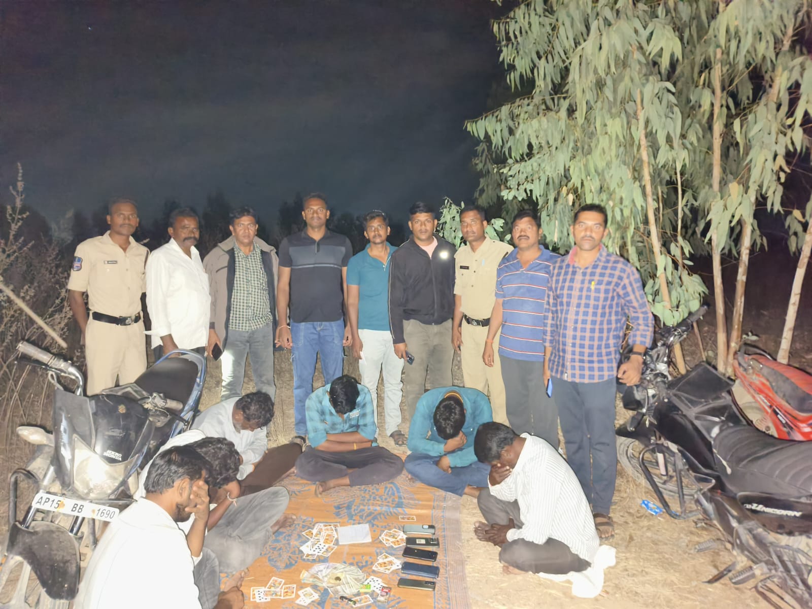 నేటి సాక్షి, బెజ్జంకి: బెజ్జంకి పోలీస్ స్టేషన్ పరిధిలోని దాచారం గ్రామ శివారులో పేకాట ఆడుతున్నారనే విశ్వసనీయ సమాచారంతో ఫిబ్రవరి 21 రాత్రి సిద్దిపేట టాస్క్ఫోర్స్ మరియు బెజ్జంకి పోలీసులు సంయుక్త దాడి నిర్వహించారు. ఈ దాడిలో ఆరుగురు వ్యక్తులను అదుపులోకి తీసుకోగా, మరో ఇద్దరు పరారయ్యారు. అదుపులోకి తీసుకున్న వారి వద్ద నుండి ₹6,480 నగదు, 5 మొబైల్ ఫోన్లు, 3 మోటార్ సైకిళ్లు స్వాధీనం చేసుకున్నారు.వీరిలో దూరశెట్టి రాజిరెడ్డి, నివాసం: గుగ్గిళ్ళ,దయ్యాల నరేష్, నివాసం: దాచారం, మెరుగు శ్రీనివాస్, నివాసం: గుగ్గిళ్ళ,బండి రాజ్కుమార్, నివాసం: గుగ్గిళ్ళ,ఏనుగుల కిషన్, నివాసం: దాచారం,కాయిత రమేష్, నివాసం: గుగ్గిళ్ళ గార్లను అదుపులోకి తీసుకున్నారు.మేకల శ్రీకాంత్, నివాసం: బెజ్జంకి,తులిశాల శేఖర్, నివాసం: గుగ్గిళ్ళ పరారీలో ఉన్నారు.వీరిపై బెజ్జంకి పోలీసులు కేసు నమోదు చేసి దర్యాప్తు ప్రారంభించారు. గ్రామాలు, పట్టణాలు, ఫామ్ హౌస్లు, ఇళ్లలో పేకాట లేదా ఇతర చట్టవ్యతిరేక కార్యకలాపాలు నిర్వహిస్తున్నట్లు సమాచారం ఉంటే, సిద్దిపేట టాస్క్ఫోర్స్ అధికారుల ఫోన్ నంబర్లు 8712667445, 8712667446, 8712667447 కు తెలియజేయాలని సూచించారు. సమాచారం అందించిన వారి వివరాలను గోప్యంగా ఉంచుతామని తెలిపారు.