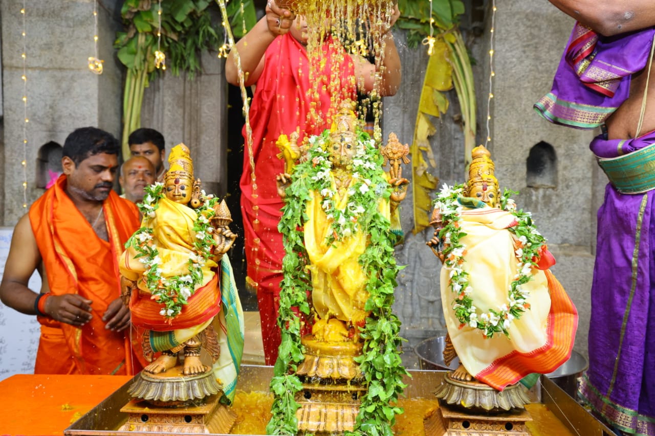 నేటి సాక్షి ప్రతినిధి గద్వాల్ ( రమేష్ ) : గద్వాల పట్టణంలోని కోటలో వెలిసిన శ్రీ భూలక్ష్మి చెన్నకేశవ స్వామి వారి బ్రహ్మోత్సవాలలో సోమవారం కళ్యాణోత్సవం అంగరంగ వైభవంగా జరిగింది. స్వామివారికి ఫల పంచామృత అభిషేకాలు నిర్వహించి విశేష పుష్పాలంకరణ చేశారు. కళ్యాణోత్సవం సందర్భంగా గద్వాల శాసనసభ్యులు బండ్ల కృష్ణమోహన్ రెడ్డి సతీమణి బండ్ల జ్యోతి స్వామివారి కల్యాణానికి పట్టు వస్త్రాలను సమర్పించారు. వేద పండితుల వేదమంత్రోచారణల మధ్య శ్రీ భూలక్ష్మి చెన్నకేశవ స్వామి కళ్యాణోత్సవాన్ని నిర్వహించగా అనేకమంది భక్తులు స్వామివారి కల్యాణాన్ని తిలకించారు. దేవాలయ విచారణ కర్త ప్రభాకర్ రావు భక్తులకు ఎలాంటి ఇబ్బందులు లేకుండా అన్ని ఏర్పాట్లు చేశారు. ఈ సందర్భంగా వేణుగోపాల చారి ఆధ్వర్యంలో స్వామివారి సంకీర్తనలు అన్నమయ్య కీర్తనలు ఆలపించారు.