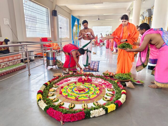 నేటి సాక్షి తిరుపతి జిల్లా, (బాదూరు బాల) : రామచంద్రాపురం మండలంలోని రాయల చెరువు కట్ట వద్ద వెలసిన శ్రీ శక్తి పీఠంలో శుక్రవారం శ్రీ రాజశ్యామలా దేవి నవరాత్రుల ఉత్సవాల్లో భాగంగా ఆరవ రోజు మంత్ర మహేశ్వరి శ్రీ శక్తి పీఠాదీశ్వరి మాతజీ శ్రీ శ్రీ శ్రీ రమ్యానందభారతీ స్వామినీ దివ్య సమక్షంలో దేవికి పంచామృత అభిషేకం ఘనంగా శాస్త్రోక్తంగా పూజలు నిర్వహించారు. అనంతరం శ్రీ రాజశ్యామలా దేవికి పసుపు, కుంకుమ లతో అలంకరణ మరియు హోమం జరిగినది. స్త్రీ మూర్తులకు సువాసినీ పూజ నిర్వహించారు. రథసప్తమి సందర్భముగా సూర్య భగవానునికి అభిషేకము విశిష్ట పూజ శ్రీ సూర్యభగవానుని ప్రీతిగా, సమస్తవిధ బాధ నివారణ కొరకు, దీర్ఘకాలిక వ్యాధి నివారణకు, మానసిక ప్రశాంతత, సంపూర్ణ ఆరోగ్యం కొరకు శ్రీ మార్తాండ భైరవ హోమము, అరుణ పారాయణ నిర్వహించారు. ఈ కార్యక్రమంలో శ్రీ శక్తి పీఠం భక్తులు పెద్ద సంఖ్యలో పాల్గొన్నారు. పీఠం కార్యనిర్వాకులు భక్తులకు తీర్థ ప్రసాదాలు అందజేశారు ప్రసాదాలు అందజేశారు.