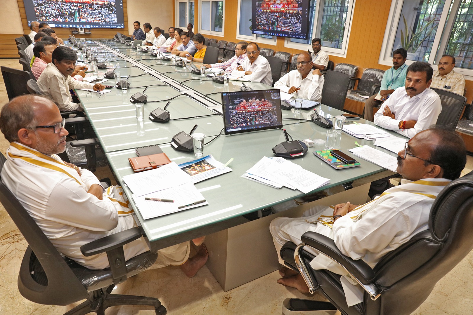 నేటి సాక్షి, తిరుపతి జిల్లా (బాదూరు బాల) : ఆంధ్రప్రదేశ్ రాష్ట్ర రాజధాని అమరావతిలో మార్చి 14న శ్రీనివాస కళ్యాణాన్ని నిర్వహిస్తున్నామని టిటిడి ఈవో జె. శ్యామల రావు తెలిపారు. టిటిడి పరిపాలనా భవనంలోని సమావేశ మందిరంలో టిటిడి అదనపు ఈవో సిహెచ్ వెంకయ్య చౌదరి, జేఈవో వి. వీరబ్రహ్మంలతో కలసి మంగళవారం ఆయన అధికారులతో సమీక్ష నిర్వహించారు. ఈ సందర్భంగా ఈవో మాట్లాడుతూ.. అమరావతి సమీపంలోని వెంకటపాలెంలో ఉన్న టిటిడి శ్రీవేంకటేశ్వర ఆలయం ప్రాంగణంలో వైభవంగా శ్రీనివాస కళ్యాణాన్ని నిర్వహిస్తున్నట్లు తెలిపారు. ప్రతిష్టాత్మకంగా శ్రీనివాస కళ్యాణాన్ని చేపట్టేందుకు అవసరమైన ఏర్పాట్లు గడుపులోపు పూర్తి చేసేందుకు కార్యాచరణ సిద్ధం చేయాలని అధికారులను ఆదేశించారు. రెండు వారాలు గడువు ఉండడంతో టిటిడి అధికారులు క్షేత్రస్థాయిలో శాఖల వారీగా పనులు పూర్తి చేయాలని అధికారులకు పలు సూచనలు చేశారు. రాష్ట్ర ముఖ్యమంత్రి వర్యులు నారా చంద్రబాబు నాయుడు హాజరుకానున్న నేపథ్యంలో అవసరమైన భద్రత, భక్తులకు క్యూలైన్లు, కల్యాణం రోజున భక్తులు వీక్షించేందుకు వీలుగా అవసరమైన ఏర్పాట్లు చేయాలని ఆదేశించారు. అమరావతి పరిసర ప్రాంతాలలో విసృతంగా ప్రచారం చేసేందుకు వీలుగా సంబంధిత జిల్లా అధికారులతో సమన్వయం చేసుకోవాలని సూచించారు. కళా బృందాలు, ఆకట్టుకునేలా విద్యుత్, పుష్పాలంకరణలు, అన్నప్రసాదాలు పంపిణీ ఏర్పాట్లు చేయాలని కోరారు. ఈ కార్యక్రమంలో సీఈ సత్యనారాయణ, పలువురు డిప్యూటీ ఈవోలు, అధికారులు పాల్గొన్నారు.