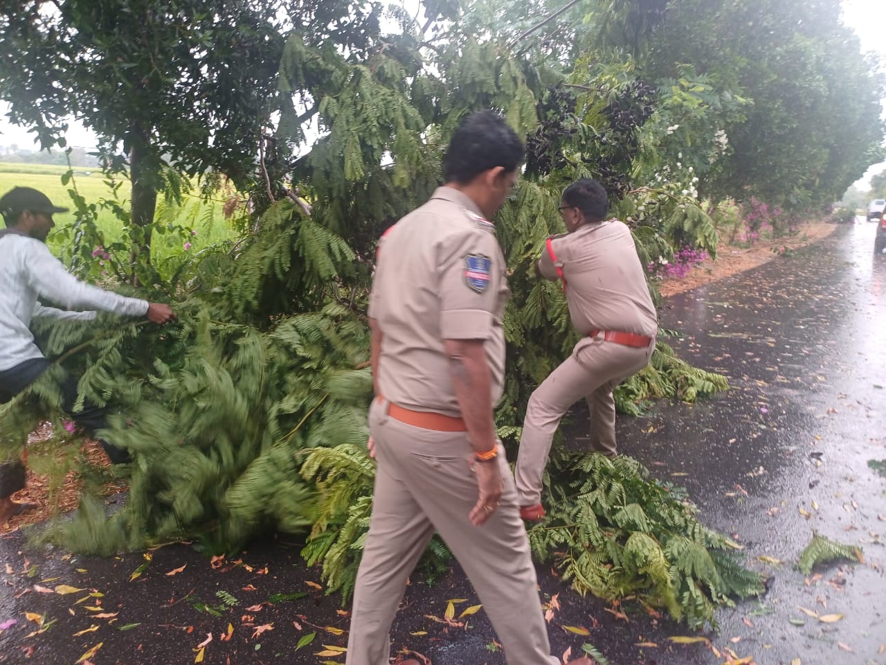 మండలంలో సాయంత్రం కురిసిన భారీ వర్షానికి వేములవాడ – కోరుట్ల ప్రధాన రహదారైనా మల్యాల గ్రామంలో భారీ వర్షానికి చెట్లు నెలకొరగడంతో చెట్లను చందుర్తి సిఐ వెంకటేశ్వర్లు. ఎస్సై అంజయ్య తొలగించి ట్రాఫిక్ జామ్ కి అంతరాయం లేకుండా పోలీస్ సిబ్బందితో కలిసి ప్రధాన రహదారిపై విరిగిపడిన చెట్లను తొలగించారు. ద్రోణి ప్రభావంతో మండల కేంద్రంలో ఉష్ణోగ్రతలు తగ్గాయి. పలు ప్రాంతాల్లో వర్షాలు కురుస్తున్నాయి. పలు చోట్ల వడగండ్ల వానలు పడుతున్నాయి. పంట నష్టం జరిగే అవకాశం ఉందని వరి, మామిడి రైతులు ఆందోళన చెందుతున్నారు. కాగా రేపు, ఎల్లుండి కూడా వర్షాలు కురిసే అవకాశం ఉందని హైదరాబాద్ వాతావరణ కేంద్రం వెల్లడించింది.
