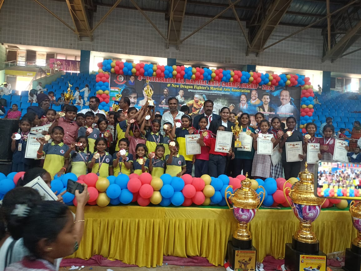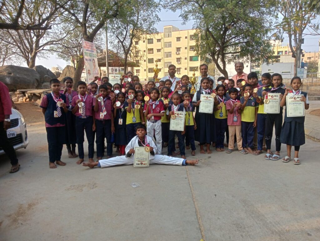 నేటి సాక్షి, కొడిమ్యాల : ఫిబ్రవరి 9 ఆదివారం రోజున, హైదరాబాదులో సరూర్ నగర్ ఎల్విఆర్ విండోస్ స్టేడియంలో జరిగిన ఇంటర్నేషనల్ కరాటే టోర్నమెంట్ లో గోల్డ్ మెడల్స్ సాధించిన నాచుపల్లి గ్రామానికి చెందిన 47 మంది స్కూలు విద్యార్థులు కొడిమ్యాల మోడల్ స్కూల్ స్టూడెంట్స్ 8 మంది. డి. సంజన, డి. శ్రీజ, ఏ. శ్రీ గౌతమి, ఎం. శ్రీలేఖ, ఏ. శ్రీ శృతిక, ఏ. కార్తిక, ఏ. అమూల్య, కె. అశ్విని, చెప్యాలా స్కూల్ విద్యార్థులు 12 మంది, మల్యాల SGR స్కూల్ విద్యార్థులు, 17 మంది, తాటి పెళ్లి వివేకానంద స్కూల్ విద్యార్థులు 9 మంది, గోల్డ్ మెడల్ హీరో భానుచందర్ గారి చేతుల మీదుగా అందుకున్నారని కోచ్ బరిగే లక్ష్యం రాజ్యం తెలిపారు.