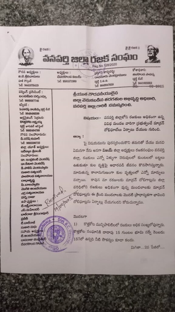జిల్లా వ్యాప్తంగా అన్ని మండలలొ ప్రభుత్వం మోడ్రన్ దోబిగాట్లను ఏర్పాటు చెయ్యాలి