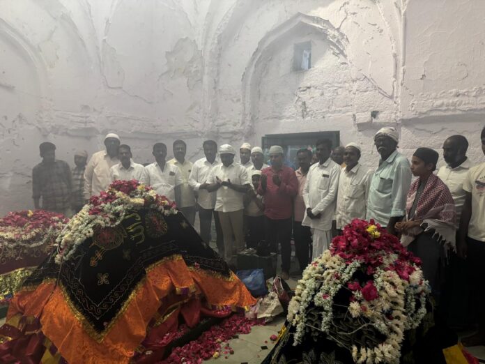 నేటిసాక్షి బ్యూరో, నిజామాబాద్ టి.ఎన్ రమేష్ : కామారెడ్డి జిల్లాలోని అల్మాజీపూర్ గుమ్మాస్ (దర్గా) వద్ద ఉర్సు లో పాల్గొన్న, మార్కెట్ కమిటీ చైర్మన్, మాజీ మున్సిపల్ చైర్మన్, ఎల్లారెడ్డి మండలంలోని, అల్మాజీపూర్ గ్రామంలో గల పురాతన కట్టడం అయిన గుమ్మాస్ (దర్గా) వద్ద ప్రతీ సంవత్సరం ఉర్సు కార్యక్రమాన్ని, హిందు మరియు ముస్లీం సోదరులు అందరు కలిసి, ఘనంగా జరుపుకుంటారు. ఈ ఉర్సు కార్యక్రమం ఆహ్వానం మేరకు మార్కెట్ కమిటీ చైర్మన్ రజిత వెంకట్టాం రెడ్డి, మాజీ మున్సిపల్ చైర్మన్ కుడుముల సత్యనారాయణ పాల్గొనడం జరిగింది. వీరితో పాటు, తిమ్మారెడ్డి మాజీ సర్పంచ్ శ్రీనివాస్ రెడ్డి, సొసైటీ డైరెక్టర్ సుఖేందర్ రెడ్డి, ఎల్లరెడ్డి మండల మైనారిటీ అధ్యక్షులు సయ్యద్ గఫర్, అల్మాజీపూరు గ్రామ మాజీ సర్పంచ్ దత్తు, తదితరులున్నారు.