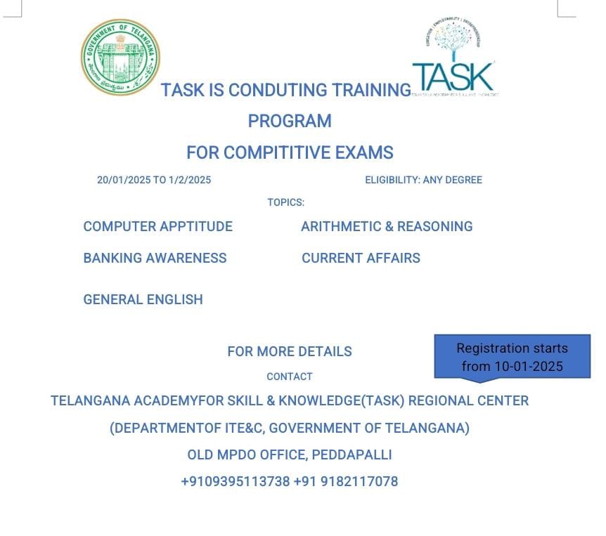జనవరి 10 నుంచి టాస్క్ ద్వారా వివిధ కోర్సులు శిక్షణకు రిజిస్ట్రేషన్లు ప్రారంభం అవుతాయని జిల్లా కలెక్టర్ కోయ శ్రీ హర్ష గురువారం ఒక ప్రకటనలో తెలిపారు. పెద్దపల్లి జిల్లాలోని నిరుద్యోగ విద్యార్థిని విద్యార్థులు ఇటీవల రాష్ట్ర ఐటీ శాఖ మంత్రివర్యులు ప్రారంభించిన టువంటి నైపుణ్యాభివృద్ధి కేంద్రం టాస్క్ ద్వారా వివిధ కోర్సులకు సంబంధించి శిక్షణ తరగతులను ప్రారంభిస్తున్నామని తెలిపారు. ఈ శిక్షణా తరగతులలో ముఖ్యంగా ప్రభుత్వ ఉద్యోగాల పోటీ పరీక్షలకు నిషినార్థులైన బోధకులచే తరగతులను నిర్వహించడం జరుగుతుందని , అంతే కాకుండా టాస్క్ కేంద్రంతో ఒప్పందం కుదుర్చుకున్న బహుళజాతి సంస్థలలో ఉద్యోగ అవకాశాలను కూడా ఇప్పించడం కోసం జాబ్ మేళాను నిర్వహించడం జరుగుతుందని అన్నారు. ఔత్సాహికులైన నిరుద్యోగ విద్యార్థులు అందరూ ఇట్టి అవకాశాన్ని సద్వినియోగపరుచుకోవాలని, ఆసక్తి కల విద్యార్థులందరూ టాస్క్ కేంద్రానికి వచ్చి తమ పేర్లను నమోదు చేసుకోవాలని, జనవరి 10 నుంచి రిజిస్ట్రేషన్లు ప్రారంభమవుతాయని, అదేవిధంగా తరగతులు జనవరి 20 నుంచి ప్రారంభమవుతాయని ,ఇతర వివరములకు పెద్దపల్లి ఎంపీడీవో ఆఫీస్ ఆవరణలో గల టాస్క్ ఆఫీసులో సంప్రదించగలరని కలెక్టర్ ఆ ప్రకటనలో పేర్కొన్నారు.