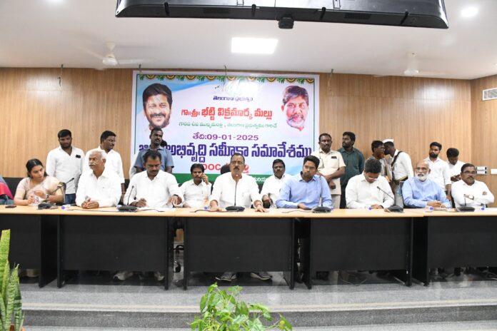 అదేవిధంగా జిల్లాలో సోషల్ వెల్ఫేర్ కు సంబంధించి పెండింగ్లో ఉన్న బిల్లులను సైతం మంజూరు చేపిస్తానని హామీ ఇచ్చారు.ఎమ్మెల్యే మెగా రెడ్డి మాట్లాడుతూ వనపర్తి నియోజకవర్గంలో పెండింగ్లో ఉన్న నీటి పారుదల ప్రాజెక్టులను వేగంగా పూర్తి చేయాలని నీటిపారుదల శాఖ చీఫ్ ఇంజనీర్ కు విజ్ఞప్తి చేశారు. బుద్ధారం, గణపురం కాల్వల నిర్మాణానికి సంబంధించి భూసేకరణ ప్రక్రియ వేగవంతం చేయాలని కోరారు. అదేవిధంగా, బుద్ధారం స్టేజి 2, గొల్లపల్లి, ఏదుల రిజర్వాయర్ల నిర్మాణానికి సంబంధించి ప్రభుత్వానికి త్వరగా ప్రతిపాదనలు పంపి పూర్తి చేసేందుకు చర్యలు తీసుకోవాలన్నారు. ఈనెల 29 లేదా 30 తేదీల్లో వనపర్తి నియోజకవర్గం లో అభివృద్ధి పనులకు శంకుస్థాపనలు చేసేందుకు ముఖ్యమంత్రి రేవంత్ రెడ్డి వచ్చే అవకాశం ఉన్నట్లు తెలిపారు.వనపర్తి నియోజకవర్గం లోని వీరాయిపల్లిలో వేరుశనగ పరిశోధన కేంద్రాన్ని ఏర్పాటు చేసేందుకు ముమ్మర ప్రయత్నాలు చేస్తున్నట్లు చెప్పారు. ఉపముఖ్యమంత్రి భట్టి విక్రమార్క పర్యటనను విజయవంతం చేసిన అధికారులకు అభినందనలు తెలియజేశారు. జిల్లా కలెక్టర్ మాట్లాడుతూ జిల్లా యంత్రాంగం పనితీరు పట్ల ఉప ముఖ్యమంత్రి భట్టి విక్రమార్క సంతృప్తి వ్యక్తం చేసినట్లు తెలిపారు. త్వరలోనే జిల్లాలో యంగ్ ఇండియా ఇంటిగ్రేటెడ్ స్కూల్స్ కి శంకుస్థాపన జరగనుందని తెలిపారు. సమావేశంలో అదనపు కలెక్టర్ స్థానిక సంస్థలు సంచిత్ గంగ్వార్, అదనపు కలెక్టర్ రెవెన్యూ జి వెంకటేశ్వర్లు, నీటిపారుదల శాఖ చీఫ్ ఇంజనీర్ జీ విజయభాస్కర్ రెడ్డి , డిసిసిబి చైర్మన్ మామిళ్ళపల్లి విష్ణువర్ధన్ రెడ్డి, వ్యవసాయ మార్కెట్ యార్డ్ చైర్మన్ శ్రీనివాస్ గౌడ్,జిల్లా అధికారులు, తదితరులు పాల్గొన్నారు.